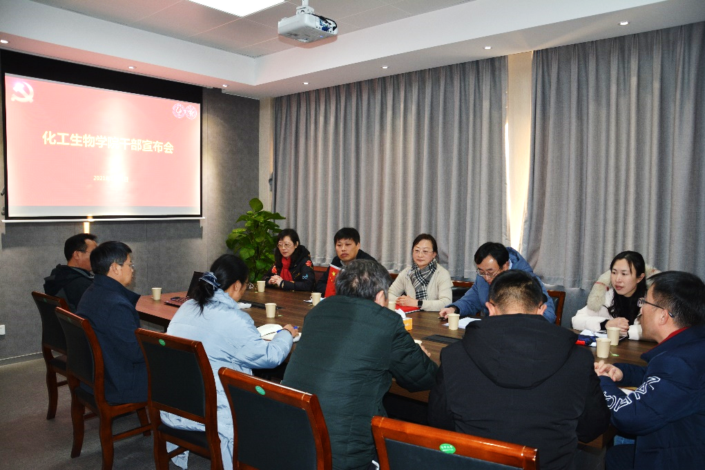 2021年1月11日下午,化工生物成人无码在三号成人无码楼4091举行成人无码领导干部宣布会。校党委组织部副部长张晓冬主持会议,成人无码党委书记宋丽贞、领导班子成员、各系部支部书记和学生工作办公室全体成员参加会议。